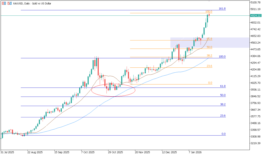 Gold continues to demonstrate exceptional strength. Following the easing of geopolitical tensions and the improvement in market sentiment triggered by the establishment of a provisional framework for dialogue regarding the Greenland agreement, prices experienced a moderate pullback. However, this correction was brief and shallow, and the bullish trend quickly resumed, pushing gold close to the $5,000 per troy ounce level.